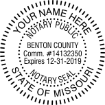 Embosser or rubber-inked stamp. Required elements: The Notary’s commission name, commission number, and the phrases “Notary Public,” “State of Missouri,” and “Notary Seal.”